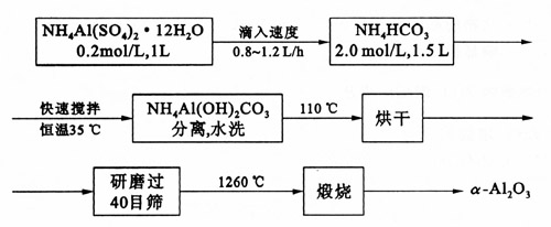 口-A12 03粉末的制備是NH4 HCO,與NH4 Al (S04)2.12HzO合成NH4 AI(OH):CO。,然后經1260℃煅燒轉化成口-Al20。其工藝流程如下: